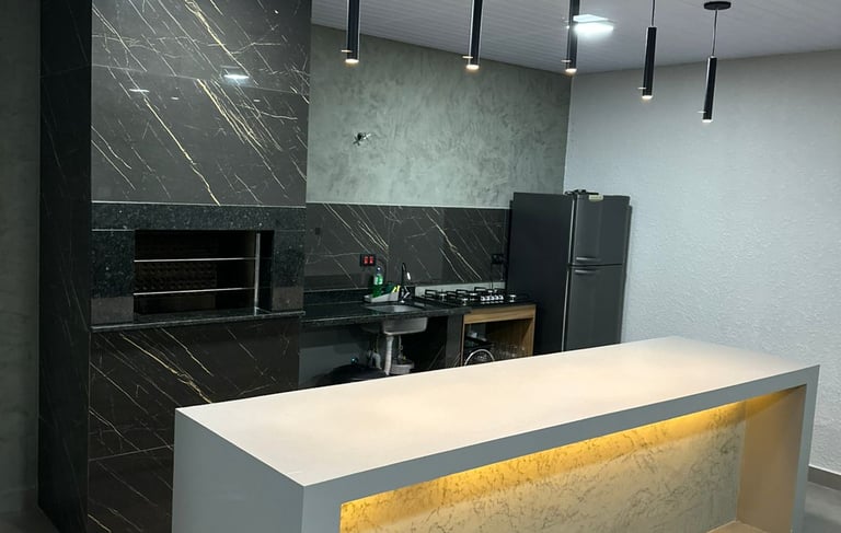 Nossa cozinha é totalmente equipada com geladeira, fogão, bancada, e todos os utensílios necessários (panelas, pegadores, travessas plasticas e muito mais).